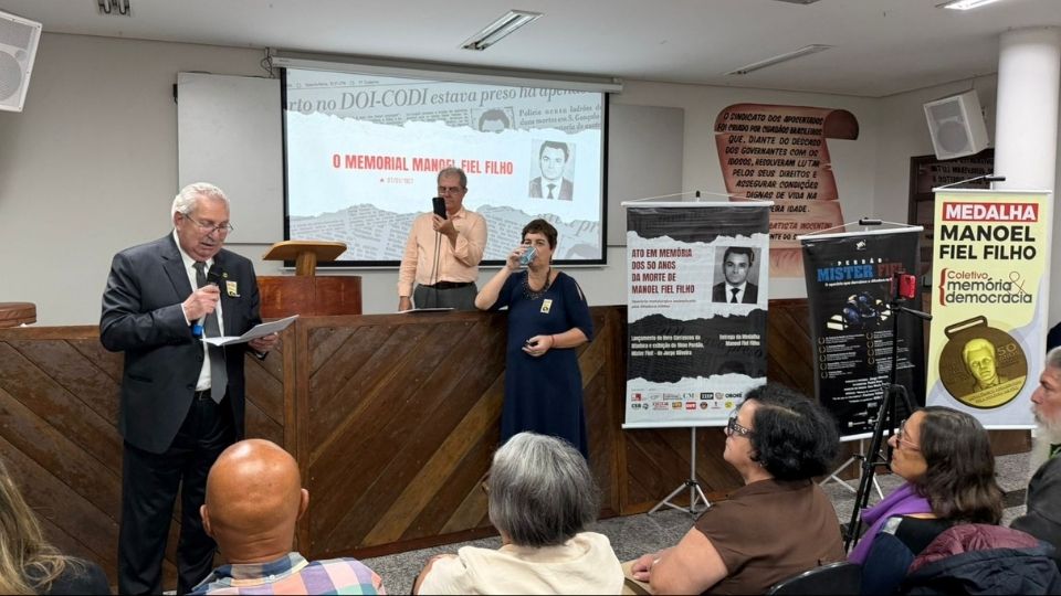 Centrais sindicais, trabalhadores e entidades de direitos humanos reuniram-se na noite desta segunda-feira (19), em São Paulo, para homenagear o operário metalúrgico Manoel Fiel Filho, preso e assassinado em 27 de janeiro de 1976 nas dependências do DOI-Codi do II Exército durante a ditadura militar. O ato que marcou os 50 anos de sua morte ocorreu na antiga sede do Sindicato dos Metalúrgicos e atual sede do Sindicato dos Aposentados, espaço considerado simbólico para a história do movimento operário brasileiro.