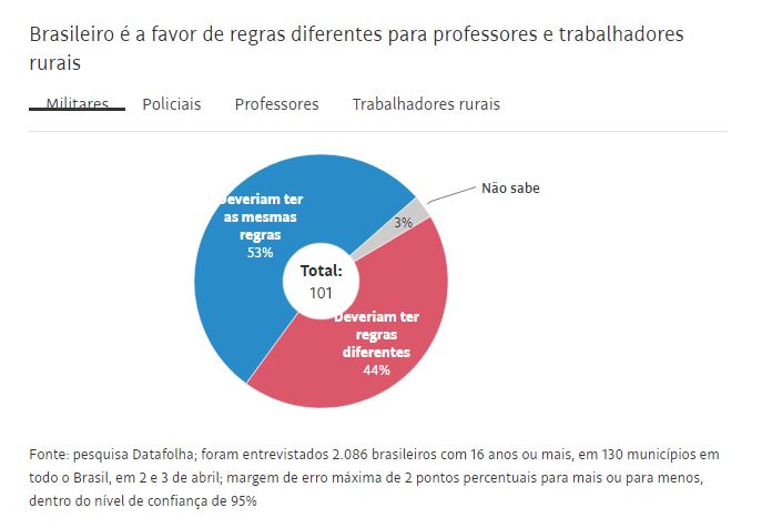 No total, 61% aprovam regras diferentes para trabalhadores rurais e 53% para professores. Há empate técnico em relação a policiais (51% apoiam regras diferentes e 47% querem regras iguais). Quanto aos militares, 54% consideram que não deveria haver diferença, e 44% a apoiam.
