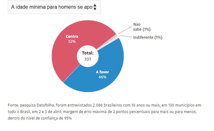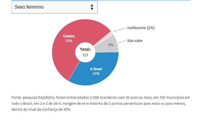 Já entre homens, 48% se dizem a favor e 45% contra, um empate técnico (a margem de erro é de dois pontos percentuais para mais ou menos).