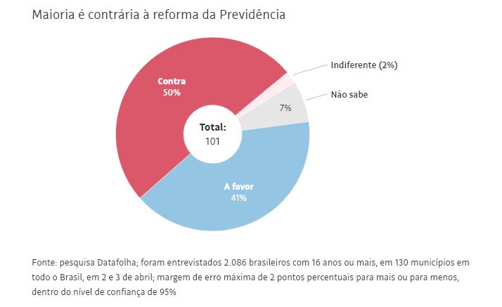 Embora majoritária, a oposição à proposta do governo Bolsonaro é menor que a registrada contra a reforma do governo Temer em abril de 2017, às vésperas de o texto ser votado por comissão especial da Câmara. Na ocasião, 71% rejeitavam a reforma apresentada por Michel Temer (MDB).