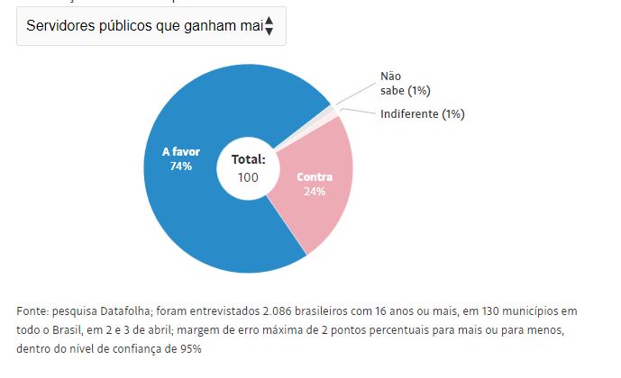 O apoio a um aperto nas regras dos servidores é expressivo também entre funcionários públicos: 74% são a favor das alíquotas progressivas e 64% aprovam o teto.