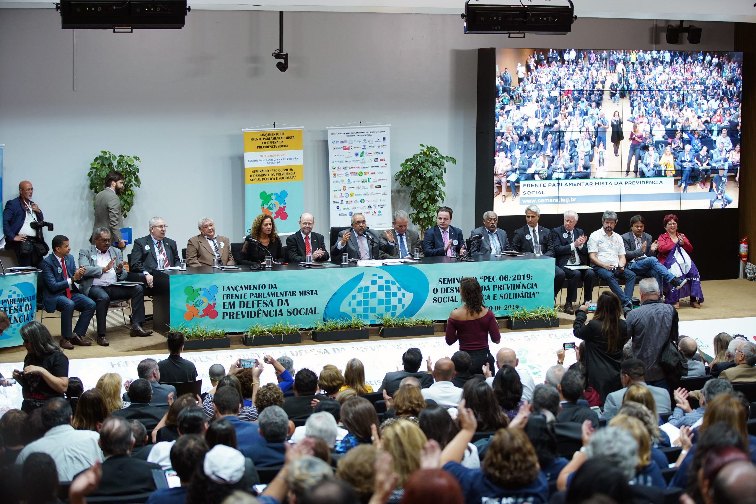 Entidades sindicais, parlamentares e associações de diversas categorias se reuniram na manhã desta quarta-feira (20), no auditório Nereu Ramos, na Câmara dos Deputados, em Brasília, para o lançamento da Frente Parlamentar Mista da Previdência Social e do seminário “PEC 06/2019: O desmonte da Previdência Social Pública e Solidária.
