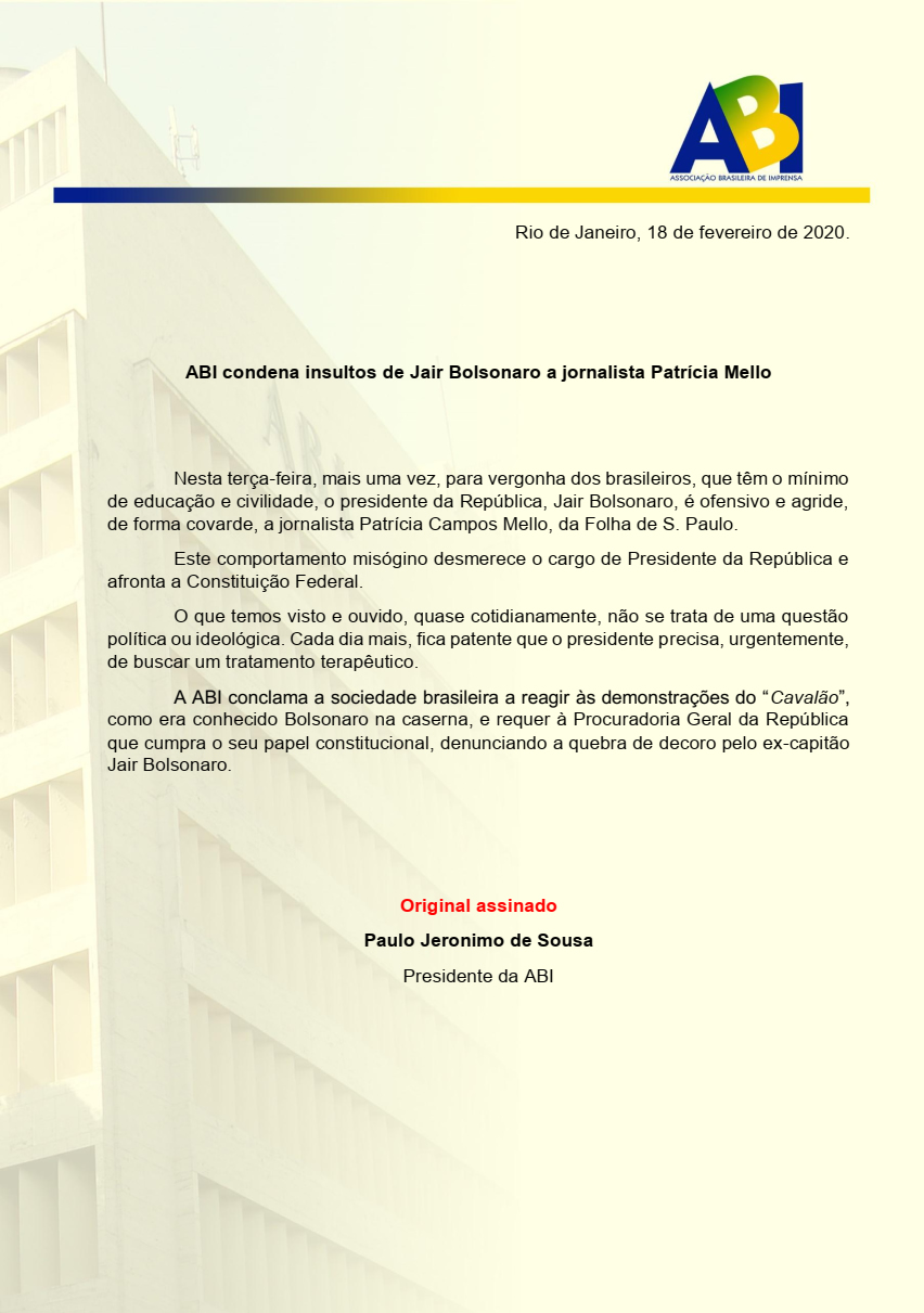 Diante dessa situação, a Associação Brasileira de Imprensa (ABI) publicou uma nota de repúdio, condenando as falas do Bolsonaro.