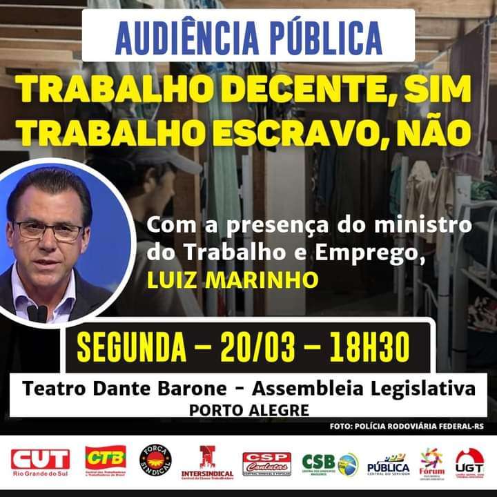 Centrais convidam para audiência pública com Luiz Marinho – As centrais sindicais promovem na próxima segunda-feira, 20 de março, uma audiência pública com o ministro do Trabalho, Luiz Marinho, em Porto Alegre (RS). O encontro começa às 18h30 e é aberto a todos.