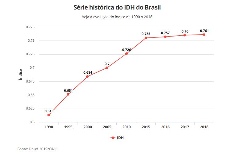 Medido anualmente, o IDH vai de 0 a 1 – quanto maior, mais desenvolvido o país – e tem como base indicadores de saúde, educação e renda. Neste ano, o Brasil alcançou o IDH de 0,761, com uma pequena melhora de 0,001 em relação ao ano passado.