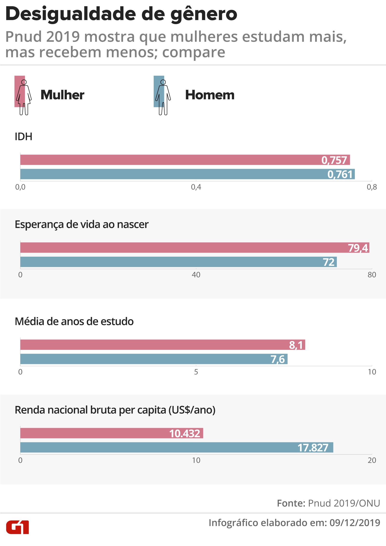 Para avaliar as disparidades e desigualdades entre homem e mulher, o Pnud apresenta o Índice de Desenvolvimento de Gênero, que traz os mesmos indicadores do IDH com separação por sexo em 166 países. O IDH para mulheres mostrou que as brasileiras estão em melhores condições de saúde e educação que os homens, mas ficam abaixo quando o assunto é renda bruta.
