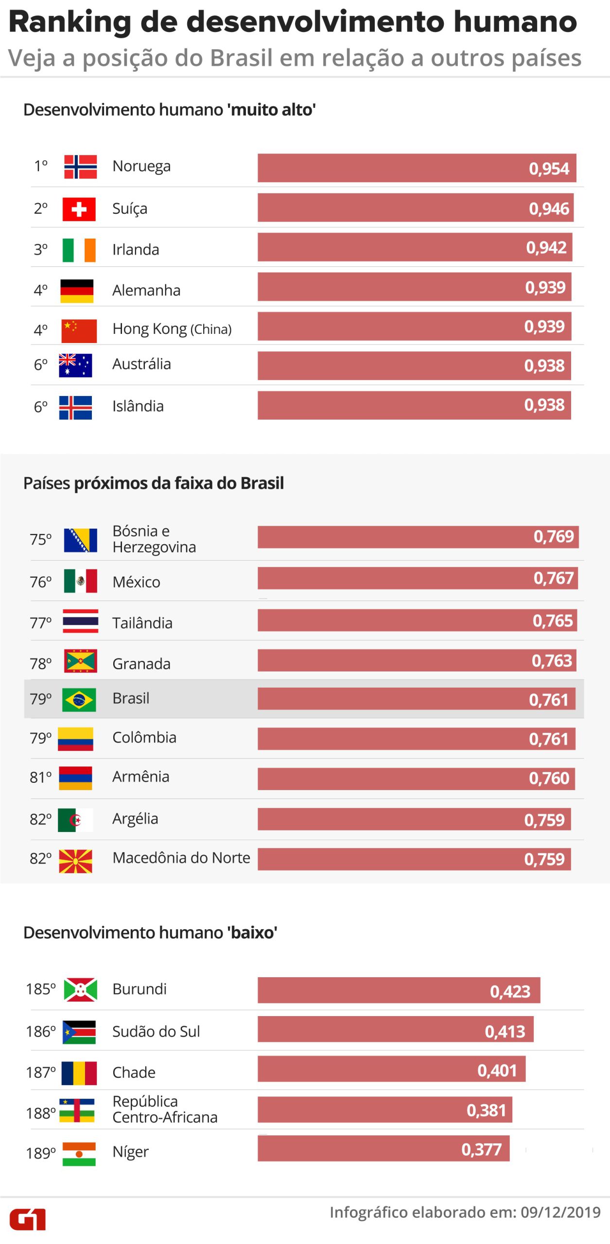 O Brasil ficou na 79ª posição no ranking do Índice de Desenvolvimento Humano (IDH) divulgado pelo Programa das Nações Unidas para o Desenvolvimento (Pnud) nesta segunda-feira (9).