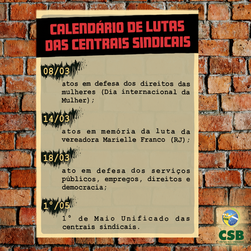 Dessa forma, foi elaborado um calendário, comum as principais organizações sociais (movimento estudantil, movimento social e partidos de oposição), de ações que terão a participação do Movimento Sindical. São elas: