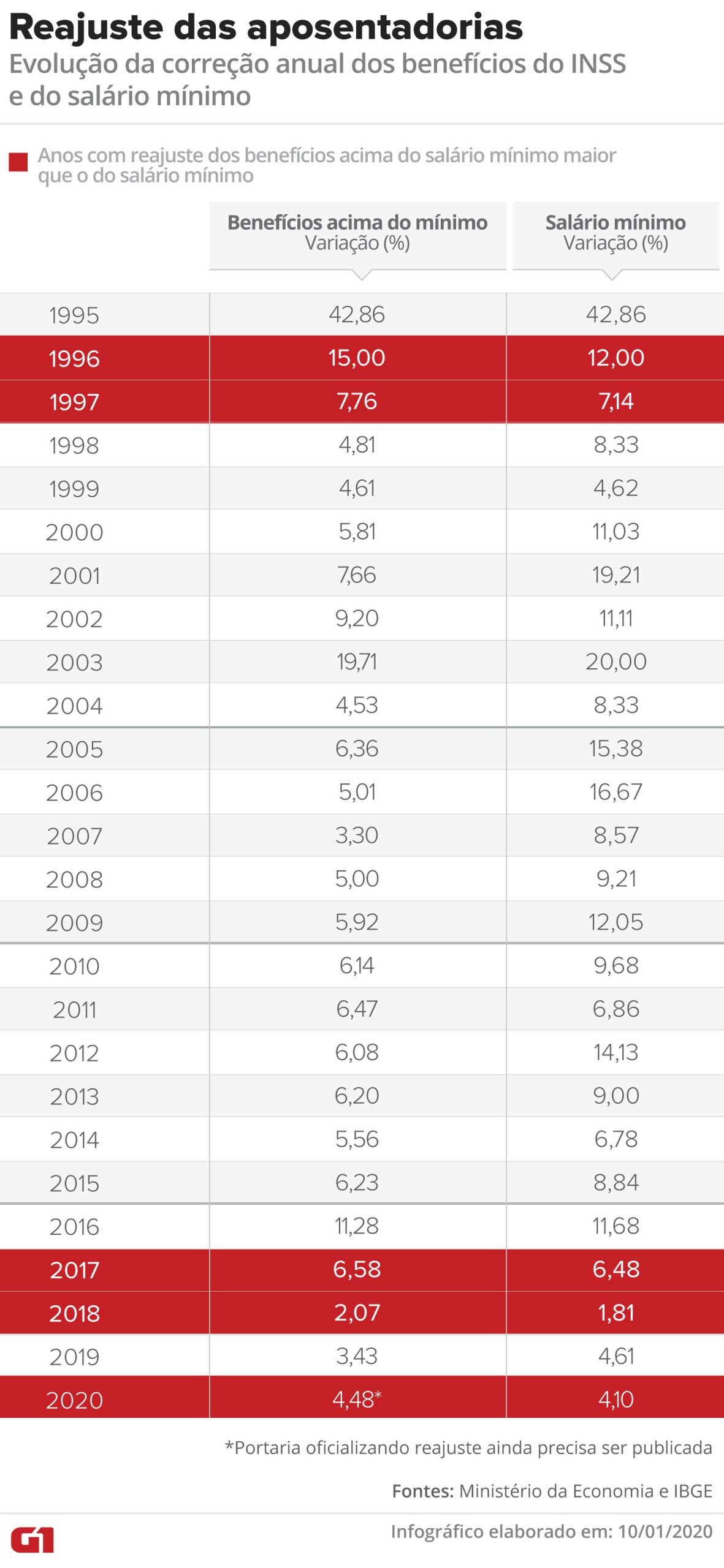 Em 2017 e 2018, por exemplo, foi concedido o reajuste somente com base na inflação porque o PIB dos anos anteriores (2015 e 2016) teve retração. Por isso, para cumprir a fórmula em vigor, somente a inflação serviu de base para o aumento.