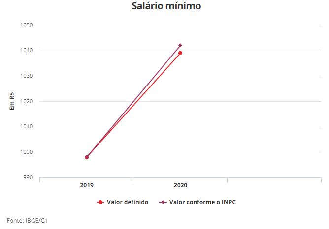 O salário mínimo de R$ 1.039 fixado pelo governo federal para este ano não repõe a inflação do ano passado. Como o mínimo do ano passado de R$ 998 aumentou em 4,1%, o ajuste para 2020 ficou abaixo do Índice Nacional de Preços ao Mercado (INPC) de 2019, de 4,48%, divulgado nesta sexta-feira (10).
