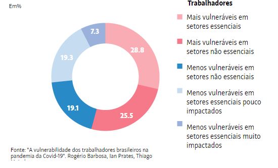 Outro grupo, correspondente a 55% do pessoal ocupado, e que reúne 52 milhões de trabalhadores, se mostra vulnerável apesar de ter vínculo formal, ou mesmo trabalhando em atividades consideradas essenciais, segundo o estudo. Juntos, os grupos representam 81% da força de trabalho.