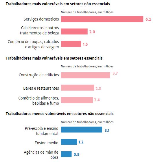 Segundo os cálculos dos pesquisadores, o grupo mais frágil reúne cerca de um quarto da força de trabalho, ou 24 milhões de pessoas. São em geral informais empregados em atividades não essenciais e que, portanto, foram mais afetados pela paralisia da economia na quarentena.