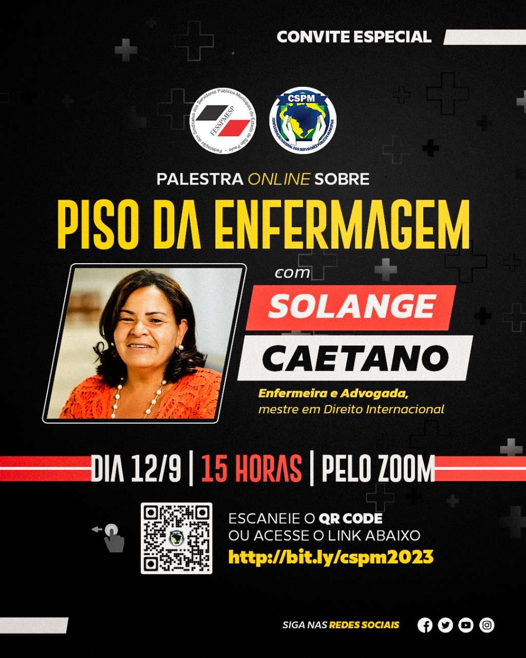 A Confederação Nacional dos Servidores Públicos Municipais (CSPM) convida para uma palestra online e gratuita no dia 12 de setembro, terça-feira, com presidente da Federação Nacional dos Enfermeiros (FNE), Solange Caetano, para tirar dúvidas de sindicalistas de todo o país sobre a aplicação do piso nacional da enfermagem. A palestra será via Zoom, a partir das 15h.