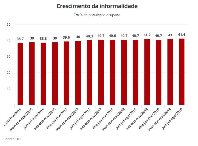 Em agosto, 41,4% da população ocupada (38,8 milhões) se encontrava na informalidade, a maior proporção desde 2016, quando a pesquisa passou a investigar empregadores e trabalhadores por conta própria sem CNPJ, superando assim o recorde anterior, registrado no trimestre encerrado em julho (41,3%).