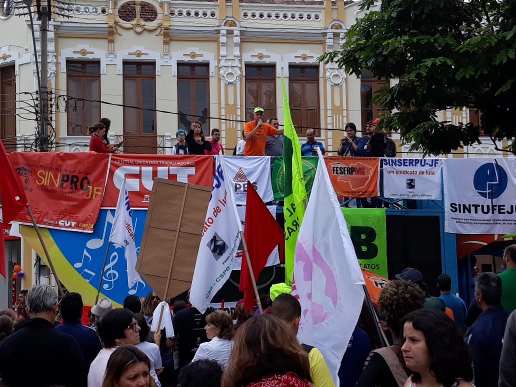 15h23- O ato na cidade de Juiz de Fora (MG) reúne uma multidão, que percorre as ruas do centro até a escadaria da Câmara Municipal.