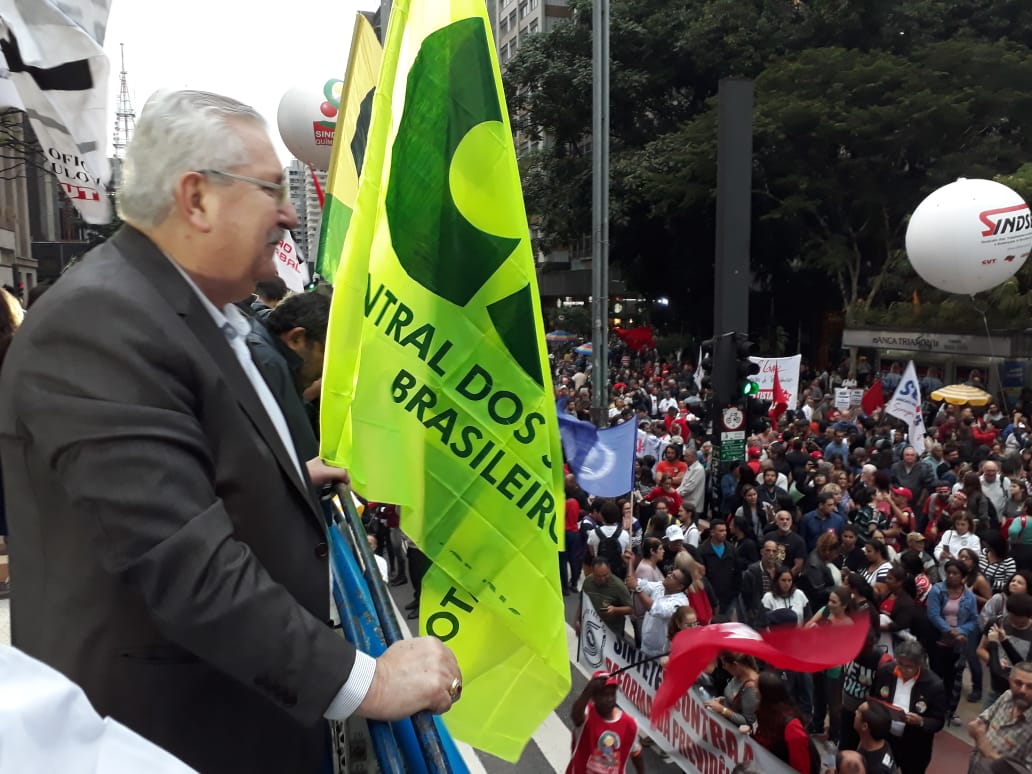 18h26- Presidente Antonio discursa para os trabalhadores presentes em ato na avenida Paulista