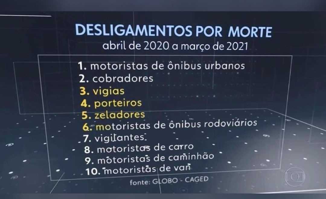 Um levantamento feito pelo Jornal Nacional revela que a maior parte dos desligamentos por morte, em 12 meses de pandemia, aconteceu entre aqueles que exerciam atividades essenciais. No topo da lista estão motoristas de ônibus urbanos e cobradores, seguidos por vigias, porteiros e zeladores, motoristas de ônibus rodoviários, vigilantes e motoristas de carros, caminhões e vans.