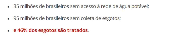 “É o que costumo falar: exportamos aviões e tecnologia agrícola, mas não conseguimos levar água às pessoas e coletar esgoto”, compara Édison Carlos. “O investimento em saneamento é muito baixo, proporcionalmente. Em energia elétrica, que já está universalizada, eles investem R$ 50 bilhões por ano.”