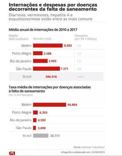 O Instituto Trata Brasil cita que, apenas com essas enfermidades, o Brasil gastou R$ 1,1 bilhão com internações entre 2010 e 2017 – isso dá uma média anual de R$ 140 milhões.