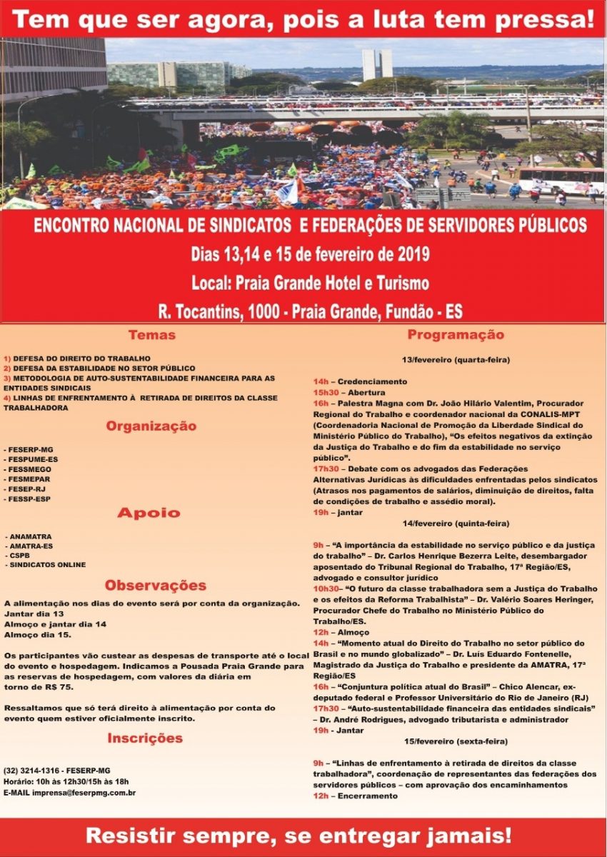 Em um momento de ataque do governo e de setores da mídia ao serviço público e aos servidores nas três esferas, municipal, estadual e federal, nos próximos dias 13,14 e 15 de fevereiro, FESERP-MG, FESPUME-ES E FESSMEGO, filiadas à Central dos Sindicatos Brasileiros (CSB), participam de encontro nacional de sindicatos e federações de servidores públicos, que acontece no Fundão, 57km da capital capixaba.