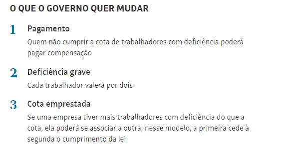 Para o advogado Dario Rabay, da área trabalhista do escritório Mattos Filho, as mudanças do projeto de lei ajustam a regra à realidade, pois muitas empresas não conseguiam cumprir a cota, o que levava muitas ao fechamento de TACs (Termos de Ajustamento de Conduta) com o MPT (Ministério Público do Trabalho).