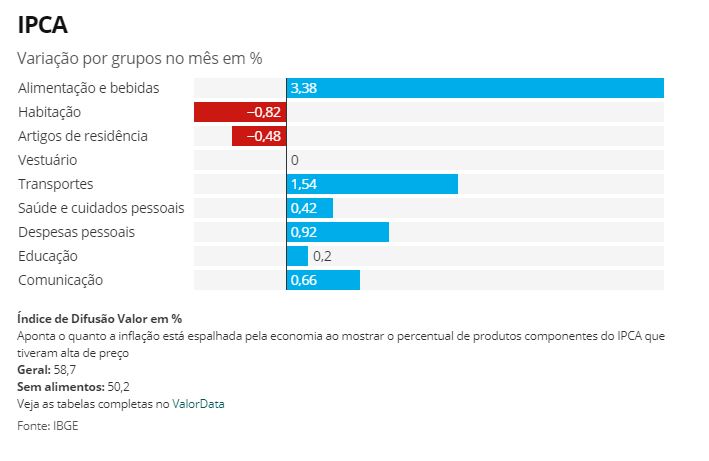 Excluindo alimentos, grupo considerado um dos mais voláteis, o indicador mostrou uma menor abrangência das altas de preços, ao sair de 54,9% para 50,2%, menor nível desde setembro de 2019, quando a inflação havia se espalhado por 47,9% da cesta por esses parâmetros.