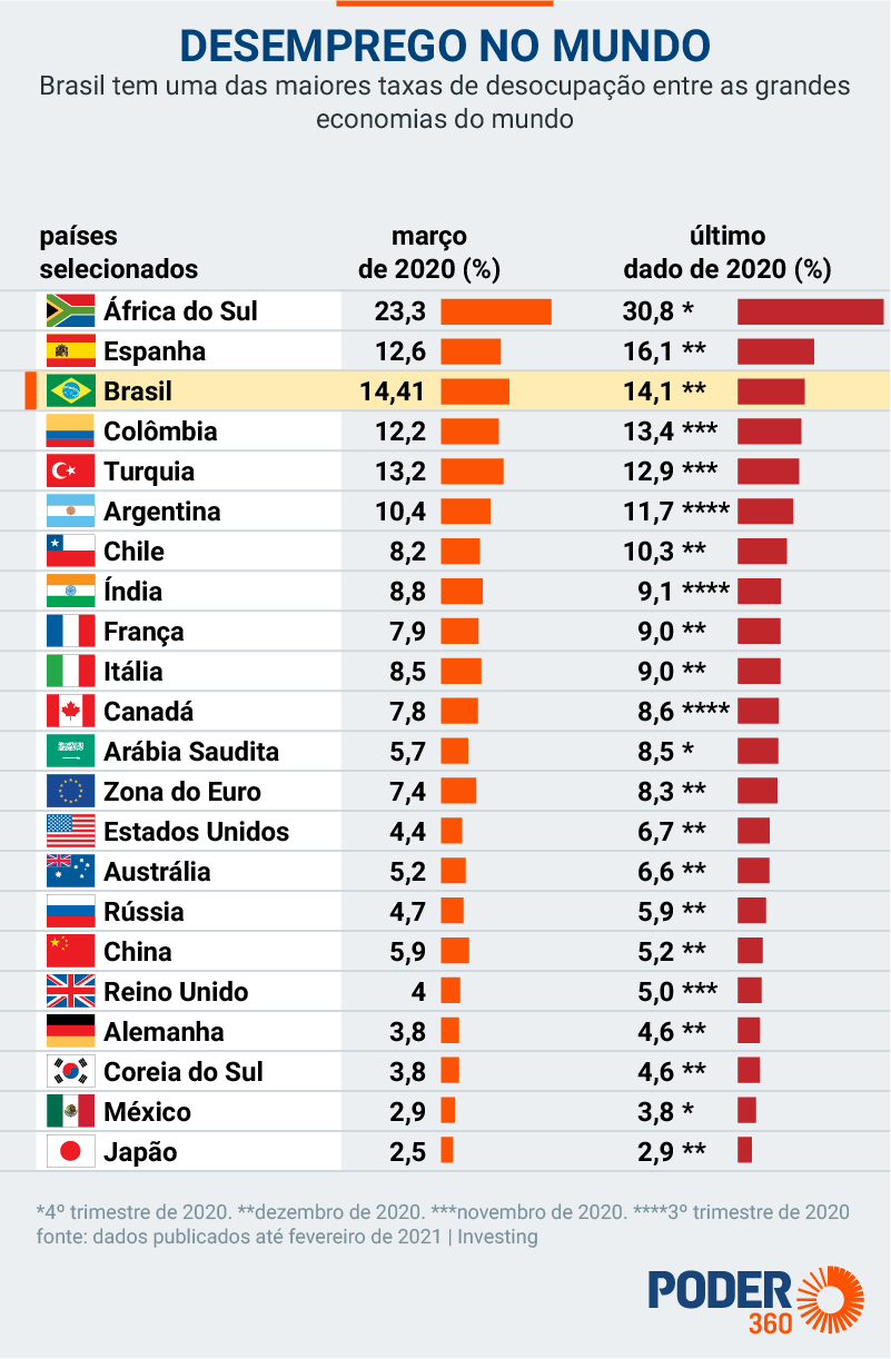 O Brasil tem uma das maiores taxas de desocupação entre os emergentes e as grandes economias do mundo: 14,1% em 2020. A desocupação atinge 14 milhões.