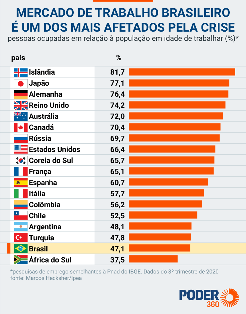 O pior resultado, em um grupo de 40 países analisados pelo economista, é o da África do Sul, que tem apenas 37,5% da sua população economicamente ativa trabalhando. Na outra ponta, está a Islândia (81,7%).