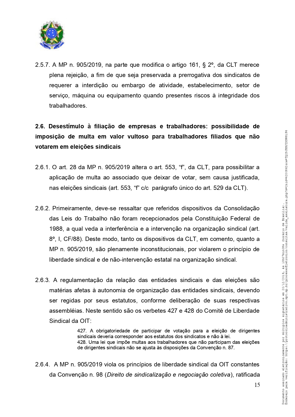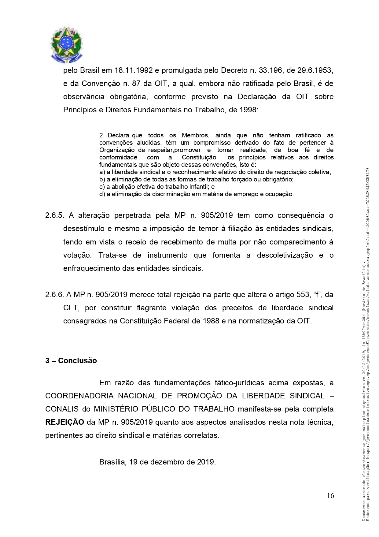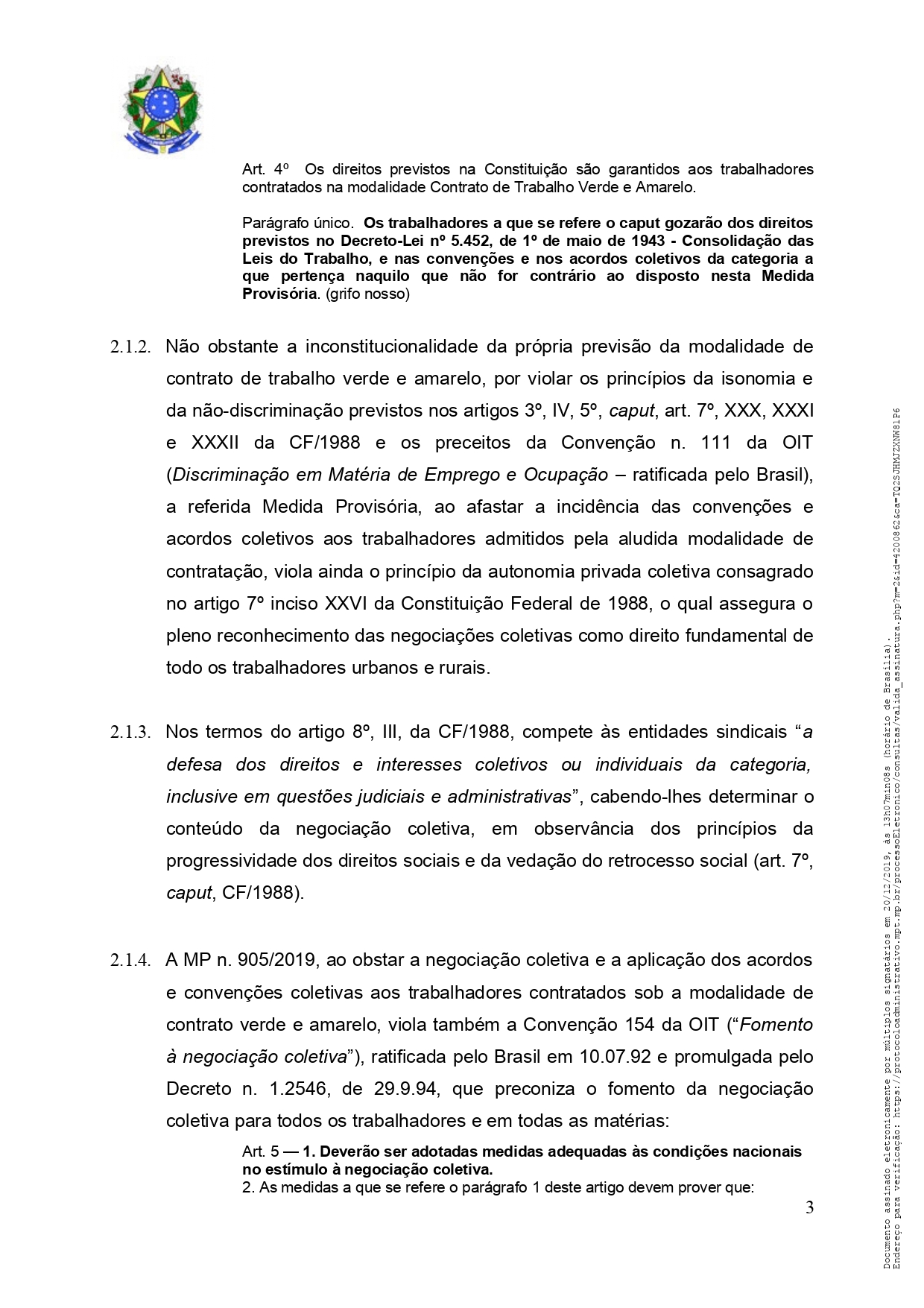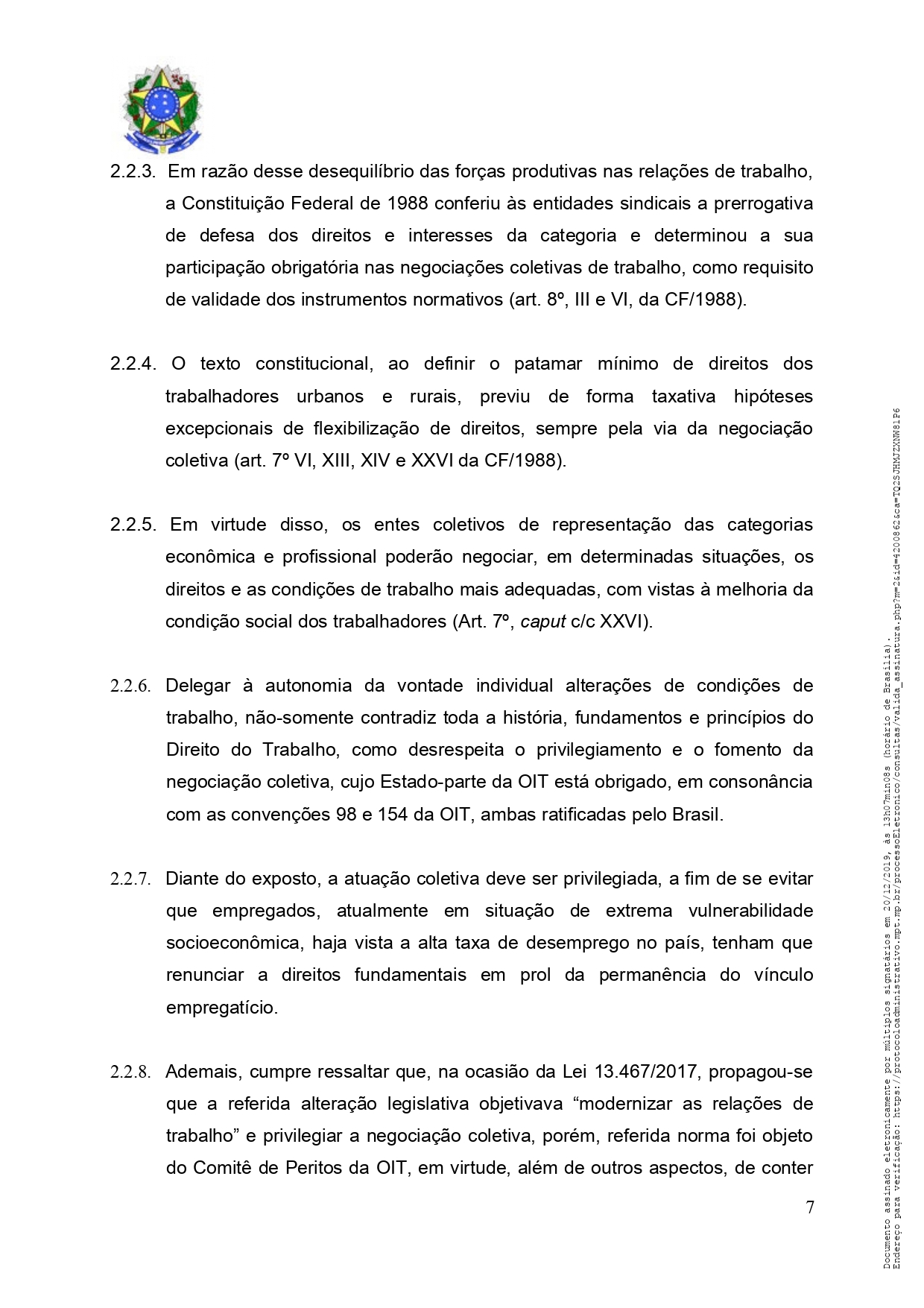 O texto chama atenção ao enfraquecimento dos acordos e convenções coletivas de trabalho, previstos na Constituição Federal, e também por obstruir o direito a negociação coletiva, promulgado pela Organização Internacional do Trabalho (OIT).