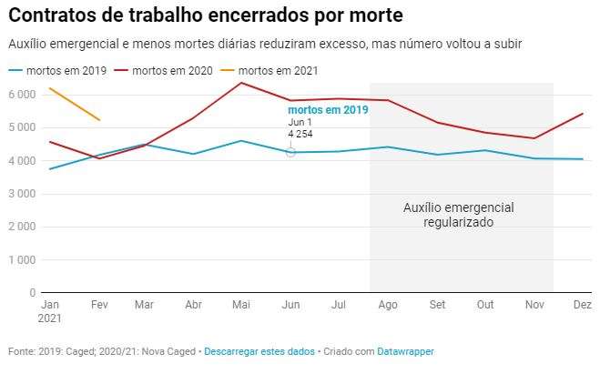 As conclusões vêm de uma análise do Novo Cadastro Geral de Empregados e Desempregados, o Novo Caged, ligado ao Ministério da Economia. O sistema coleta, mês a mês, informações sobre contratos formais de emprego, inclusive o motivo de encerramentos. Morte é um deles, embora não seja informada a causa. Por isso, não é possível saber se todo o contingente de óbitos se deve apenas à covid-19, mas é possível adaptar o conceito de “excesso de mortes” com base neste banco de dados.