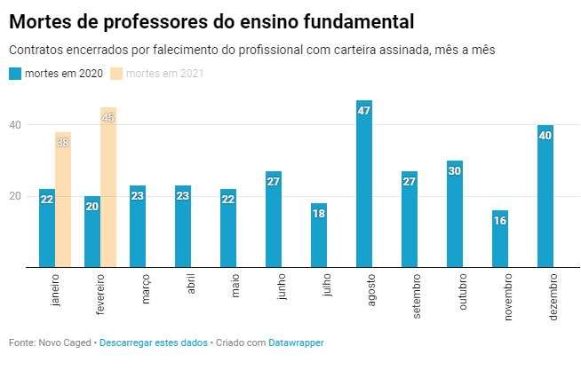 Outra categoria analisada foi a dos professores. Em todo o Brasil, houve pressão de pais e diretores de escolas particulares para a volta das aulas presenciais. No primeiro semestre, o ensino remoto com todas as suas dificuldades foi a praxe. Depois de julho, muitas escolas voltaram a abrir. Entre professores contratados para lecionar no ensino fundamental, houve 137 mortes no primeiro semestre e 178 no segundo. Em janeiro e fevereiro, 83 contratos formais de professores do fundamental foram encerrados por morte, contra 42 no mesmo período do ano passado.