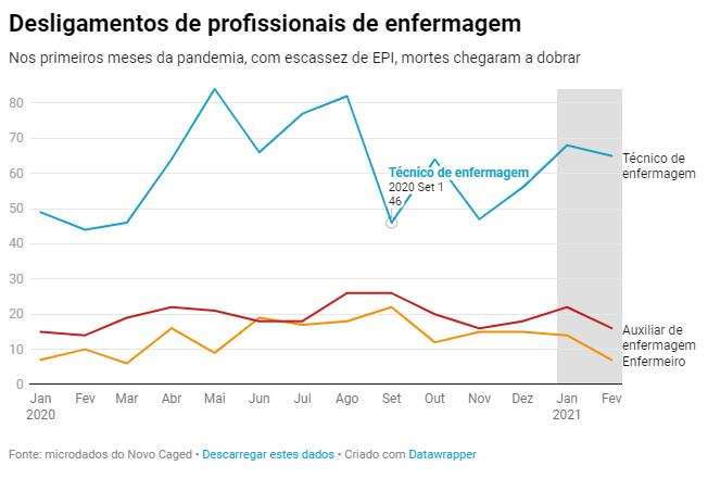 Mesmo tratando apenas de profissionais com vínculo empregatício formal, os dados do Caged são mais altos do que os do Conselho Federal de Enfermagem. Em janeiro, segundo eles, 47 profissionais do ramo haviam morrido. O Caged contabiliza 104 contratos encerrados no mês devido à morte do profissional.