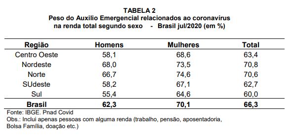 - Na perspectiva de gênero, o Auxílio Emergencial tem um peso ainda maior: na média geral do Brasil, chega a 70% para as mulheres e ultrapassa esse percentual nas regiões Norte e Nordeste.