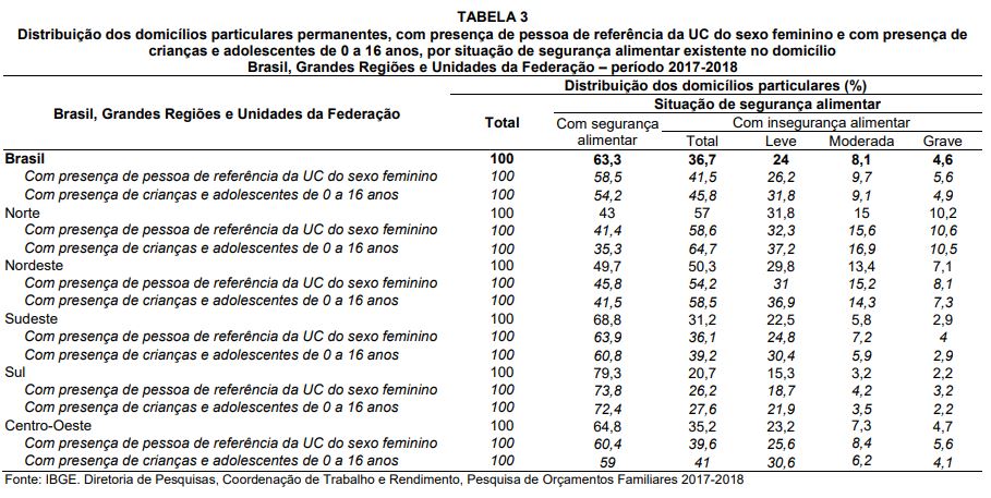 - Do total de domicílios que tinham crianças e adolescentes de 0 a 16 anos, 45,8% apresentavam alguma insegurança alimentar.