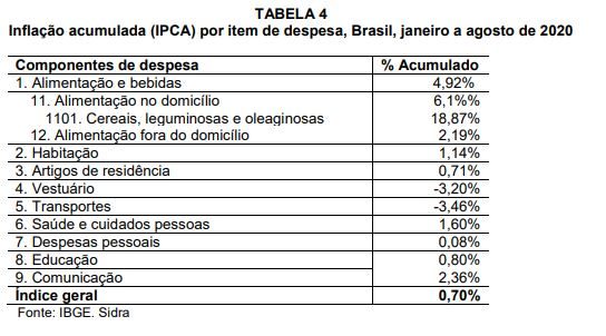 - Apesar de o IPCA (Índice Nacional de Preços ao Consumidor Amplo) estarpróximo de zero (0,7%) no acumulado entre janeiro a agosto de 2020, houve uma variação de preços expressiva nos alimentos, especialmente na alimentação no domicílio. No segmento de cereais, leguminosas e oleaginosas, o aumento dos preços no período foi de 18,9%, ou seja, mais de 20 vezes maior que a inflação geral acumulada (Tabela 4). Os alimentos básicos tiveram aumentos expressivos: o preço do feijão subiu 35,89%, o do leite longa vida, 23% e o do arroz, 19,24%, todos itens mais consumidos pela população das menores faixas de renda (Gráfico 1).