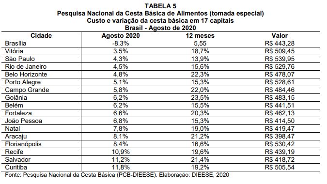 - Como expressão dessa alta, o valor da cesta básica, pesquisada pelo DIEESE em 17 capitais, subiu em 16 cidades em agosto de 2020, exceto em Brasília, e em todos os municípios investigados, nos últimos 12 meses. Em agosto, o maior valor foi registrado em São Paulo (SP), R$ 539,95, enquanto a maior alta percentual no mês ocorreu em Curitiba (PR), que registrou aumento de 11,8% (Tabela 5).