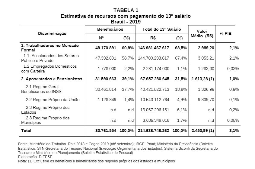 Até dezembro de 2019, o pagamento do 13º salário deve injetar na economia brasileira mais de R$ 214 bilhões. Este montante representa aproximadamente 3% do Produto Interno Bruto (PIB) do país e será pago aos trabalhadores do mercado formal, inclusive aos empregados domésticos; aos beneficiários da Previdência Social e aposentados e beneficiários de pensão da União e dos estados e municípios. Cerca de 81 milhões de brasileiros serão beneficiados com rendimento adicional, em média, de R$ 2.451. As estimativas são do DIEESE (Departamento Intersindical de Estatística e Estudos Socioeconômicos).