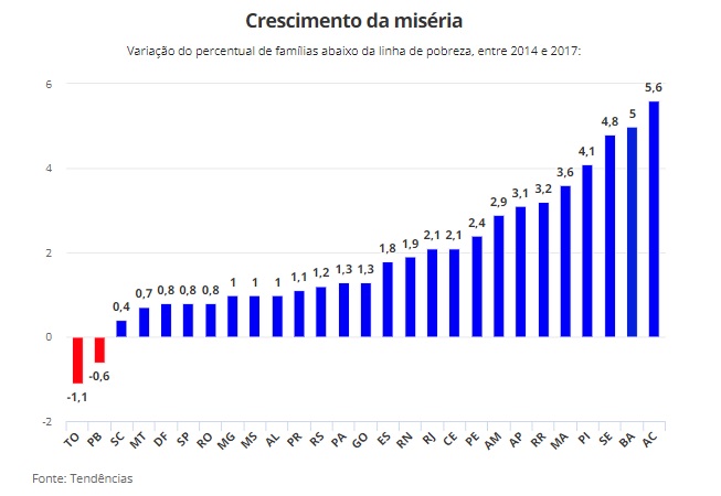 O Acre foi o estado que mais teve um aumento da pobreza extrema entre 2014 e 2017, de 5,6%. Enquanto isso, estados do Sul e Sudeste estão entre os menos prejudicados pela crise, apesar da piora generalizada.
