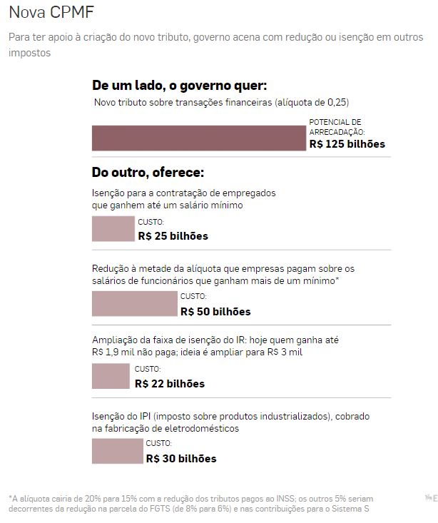 A conta da fatura total de medidas de compensação à recriação da CPMF seria de R$ 127 bilhões. Pelas contas do governo, uma nova contribuição com alíquota de 0,2% cobrada tanto no crédito (entrada dos recursos na conta) como no débito (qualquer retirada de recursos) pode arrecadar R$ 125 bilhões (desse valor R$ 50 bilhões voltariam para a Previdência para compensar a desoneração).