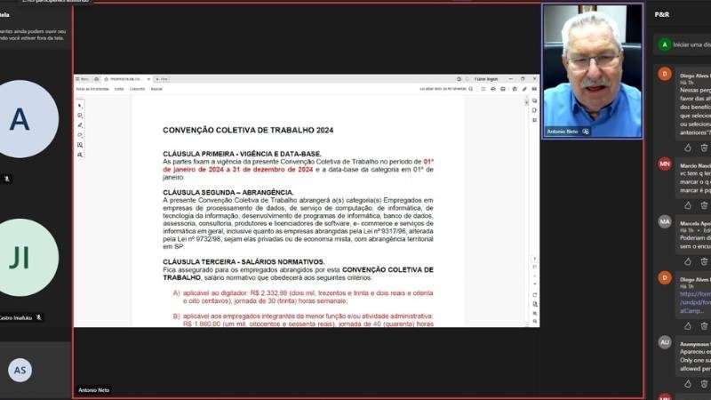 A assembleia foi conduzida pelo presidente do Sindpd e da CSB, Antonio Neto, que lembrou a importância do trabalho de divulgação do sindicato para convocar os trabalhadores, com mais de 500 mil e-mails enviados, edital em jornal de grande circulação e quase 200 mil disparos de SMS para celulares de profissionais cadastrados, além de milhares de mensagens enviadas pelo Whatsapp.