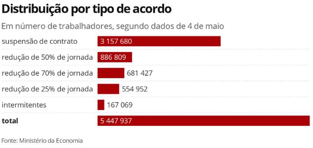 Os acordos relacionados à suspensão de contratos representam a maior parte do total: 58% ou 3,157 milhões. Nos casos de redução de jornada, 16% (886 mil) foram de 50%, 12% (681 mil) de 70%, e 10% (554 mil) de 25%. Nos casos dos trabalhadores intermitentes, os benefícios somam até o momento 3% do total (167 mil).