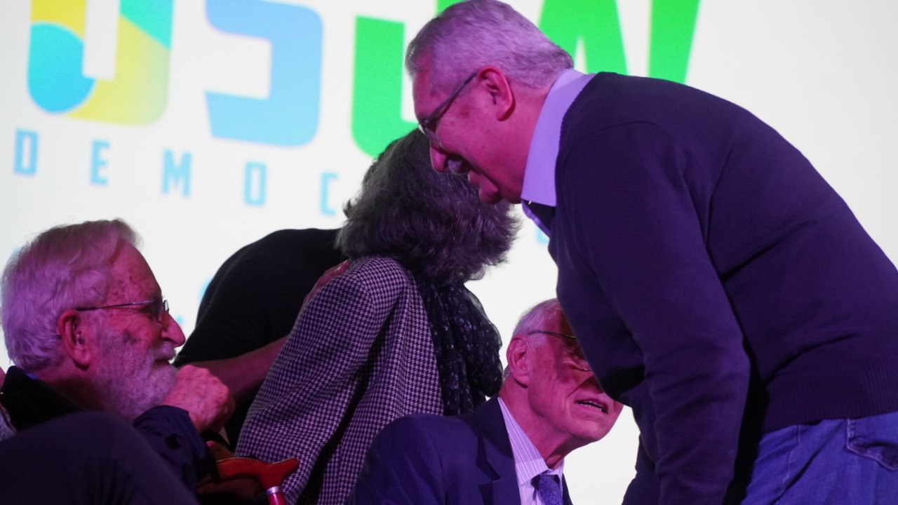 Já no fim do ato, o linguista Noam Chomsky, considerado por muitos o maior intelectual vivo, marcou presença no ato falando dos riscos que as mais consolidadas democracias ao redor do mundo vêm sofrendo com medidas arbitrárias de seus governantes.