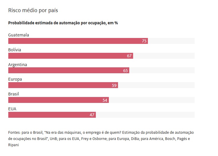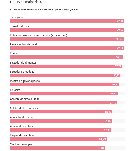 Considerando os trabalhadores com carteira assinada no fim de 2017 (segundo a Rais, do Ministério do Trabalho), cerca de 25 milhões (57,37%) ocupavam vagas com probabilidade muito alta (acima de 80%) ou alta (de 60% a 80%) de automação.
