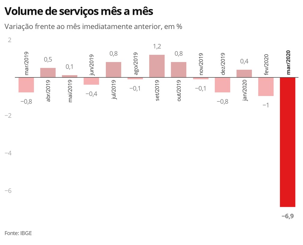 O volume de serviços prestados no Brasil teve queda recorde de 6,9% em março, na comparação com fevereiro, refletindo os primeiros impactos da pandemia de coronavírus na atividade econômica, segundo dados divulgados nesta terça-feira (12) pelo Instituto Brasileiro de Geografia e Estatística (IBGE).